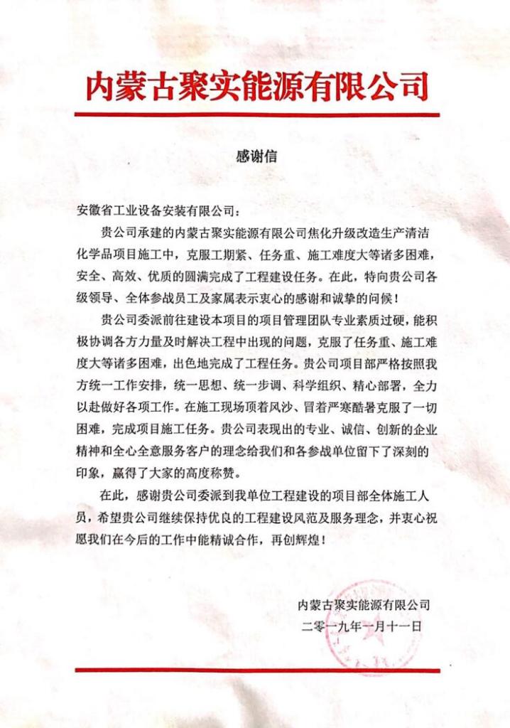 2019年1月14日,安徽安裝承建的內蒙古聚實(shí)能源有限公司焦化升級改造生產(chǎn)清潔化學(xué)品項目,克服工期緊、任務(wù)重、施工難度大等諸多困難,安全、高效、優(yōu)質(zhì)的圓滿(mǎn)完成了工程建設任務(wù)。業(yè)主內蒙古聚實(shí)能源公司總經(jīng)理張春軍向公司贈送內容為“力克萬(wàn)難 保中交節點(diǎn);眾志成城 創(chuàng )優(yōu)質(zhì)履約”的錦旗。