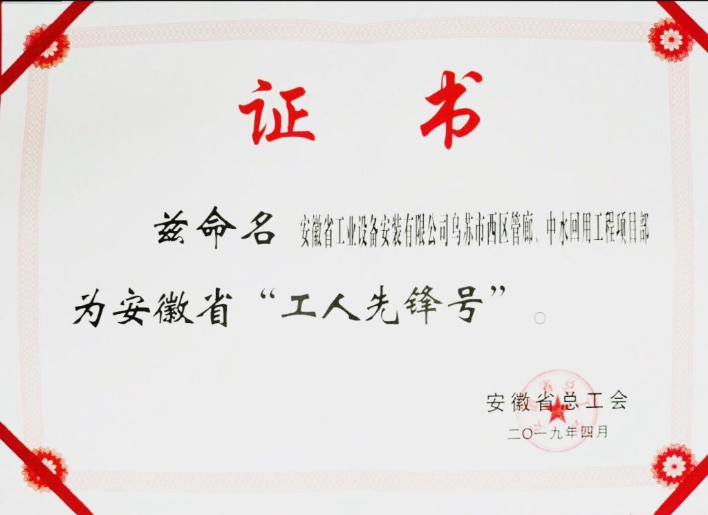 安徽安裝新疆烏蘇管廊、中水項目部榮獲“安徽省工人先鋒號”稱(chēng)號