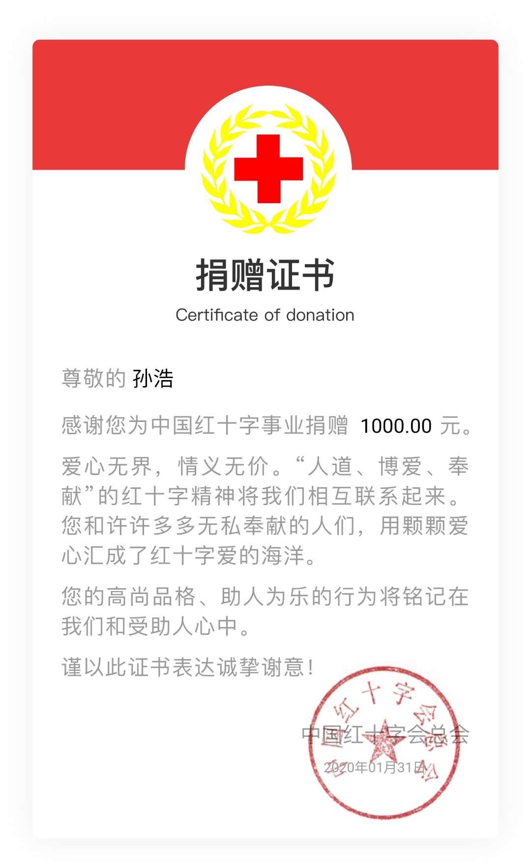 自新型冠狀病毒引發(fā)的肺炎疫情從湖北武漢爆發(fā)以來(lái),始終牽動(dòng)著(zhù)眾人的心,更有不少愛(ài)心人士主動(dòng)奉獻愛(ài)心。1月31日,孫浩一家三口懷著(zhù)對武漢疫區同胞深深的愛(ài),向中國紅十字會(huì )捐款抗擊疫情,以表達對武漢疫區人民的關(guān)愛(ài)。