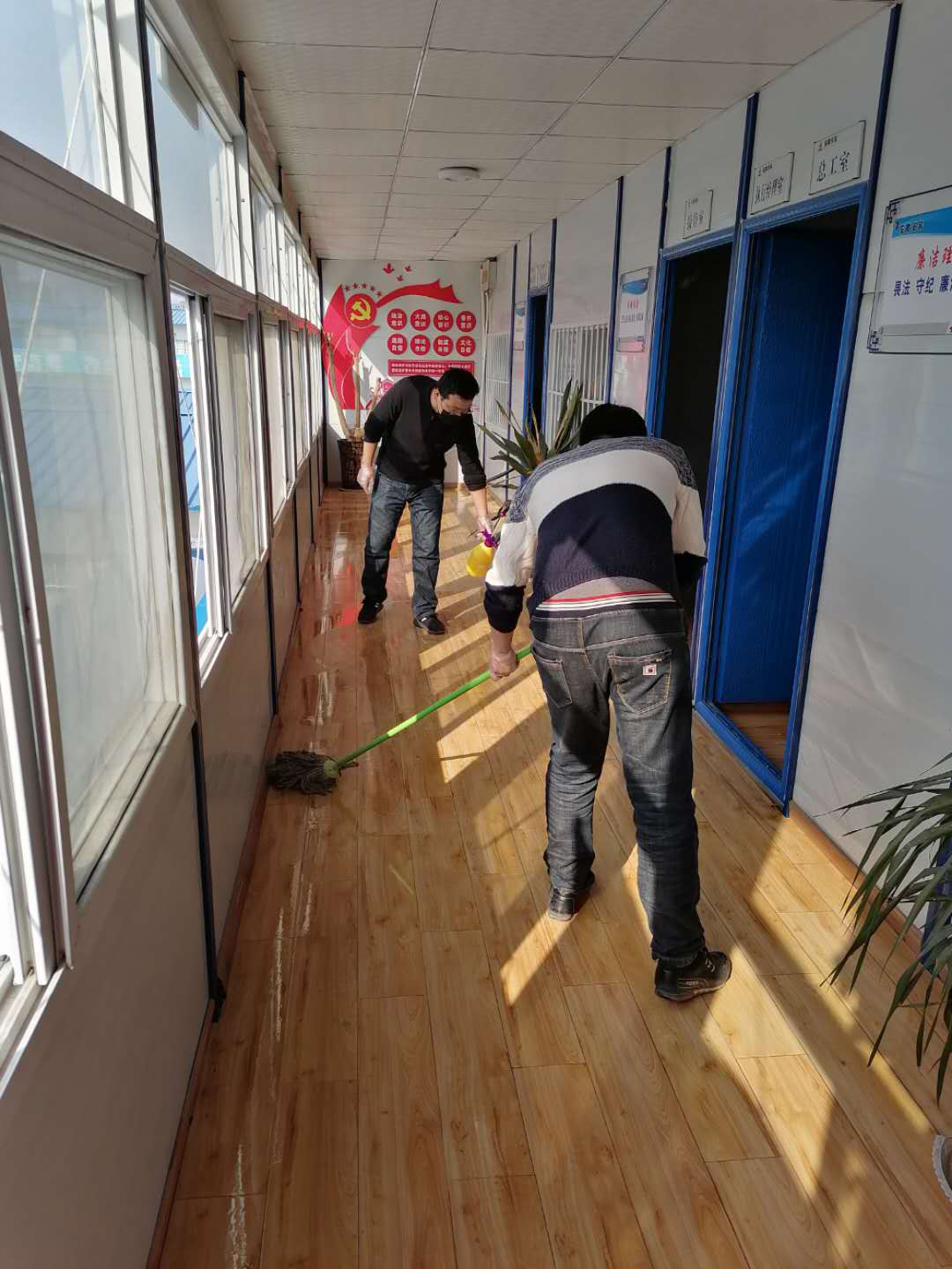 切實(shí)做好后勤保障工作。項目部對員工及工人的食宿進(jìn)行統一管理。項目食堂由專(zhuān)人進(jìn)行食物采買(mǎi),確保食材的質(zhì)和量,每日記錄就餐情況統計表保證所有人員一日三餐安全健康。施工現場(chǎng)、辦公區域及宿舍每日安排專(zhuān)人定時(shí)消毒。宿舍設立住宿人員值班表,每天打掃衛生保持房間清潔。