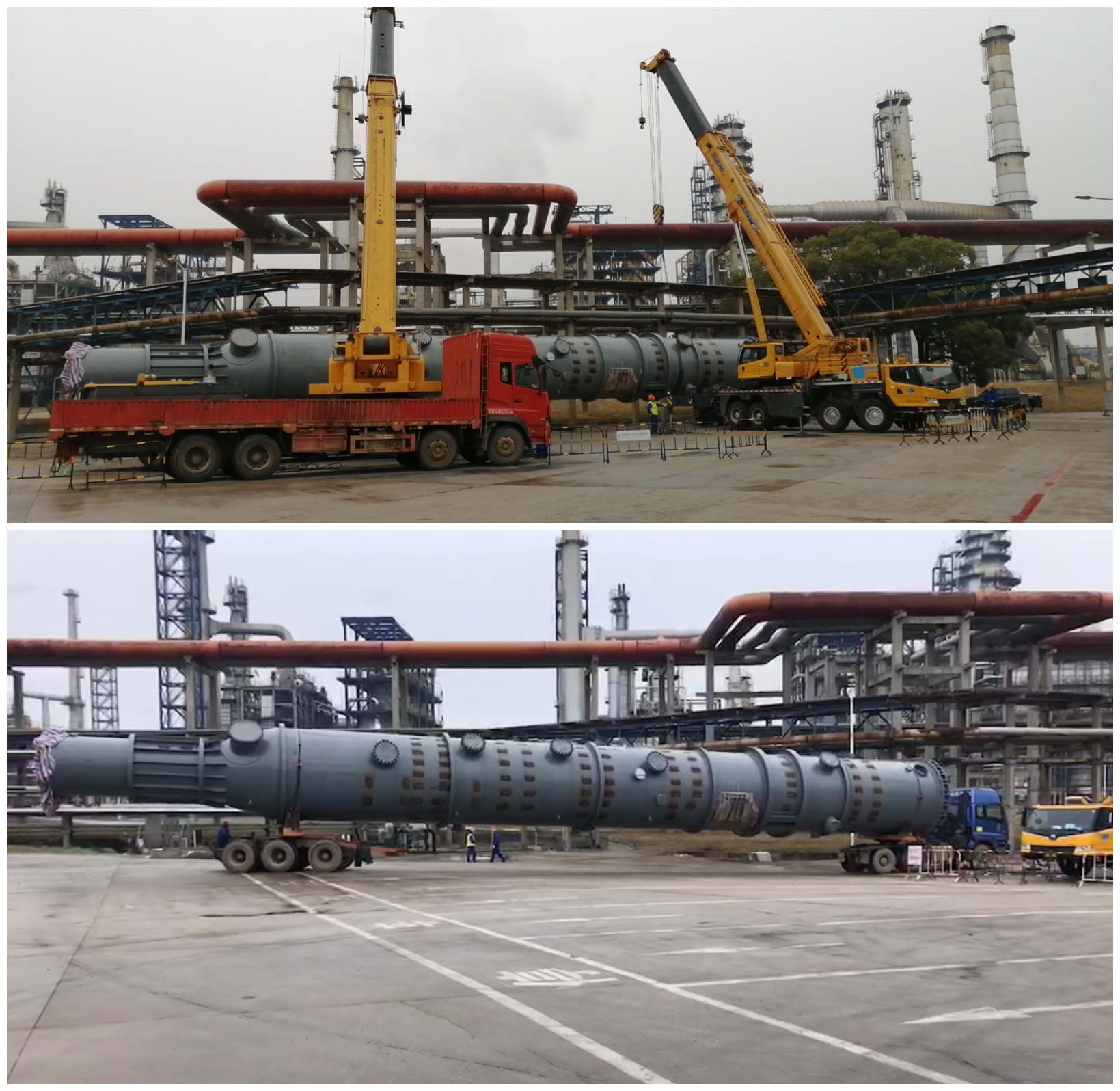 “Ⅰ、Ⅱ硫磺回收裝置增設煙氣后堿洗流程項目”是能使煙氣SO2排放濃度從原先的50mg/m3下降至≤10mg/m3的環(huán)保工程。但該項工程僅一個(gè)脫硫塔下段就高達33米,重達58噸,體積十分龐大,而現場(chǎng)存在作業(yè)場(chǎng)地狹小,固有障礙物多、吊重荷載大等諸多問(wèn)題,無(wú)法將設備一次性運至施工現場(chǎng)并進(jìn)行下段焊接梯子、平臺等附塔“穿衣戴帽”作業(yè)。對此,項目部多次優(yōu)化倒運方案,提前合理部署,采用額定荷載分別為220噸和90噸的汽車(chē)吊實(shí)施雙機抬吊作業(yè)和專(zhuān)為公路橋梁設計使用的炮車(chē)運輸,從而順利完成了倒運工作。同時(shí),為爭取時(shí)間,安排班組實(shí)行夜間倒班制,管理人員輪班制,為接下來(lái)的脫硫塔“穿衣戴帽”和上下段空中組對焊接作業(yè)爭取了寶貴時(shí)間。