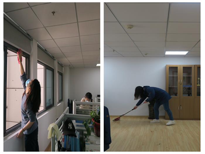 風(fēng)和日麗,大家早早的來(lái)到辦公室,三五一組,相互配合,擼起袖子加油干。開(kāi)窗通風(fēng)、地面清掃、消毒殺菌、門(mén)窗擦拭、書(shū)柜整理、綠植澆灌、垃圾傾倒……大家熱情高漲、干勁十足,仔仔細細清理著(zhù)每個(gè)角落,不遺漏任何一個(gè)死角。經(jīng)過(guò)半個(gè)多小時(shí)的辛勤勞動(dòng),辦公區域頓時(shí)變得更加清新明亮、干凈整潔,不由得令人耳目一新、賞心悅目。隨后,分公司文明衛生檢查組還對各部門(mén)的衛生情況進(jìn)行了嚴格打分,并對檢查結果進(jìn)行了通報。