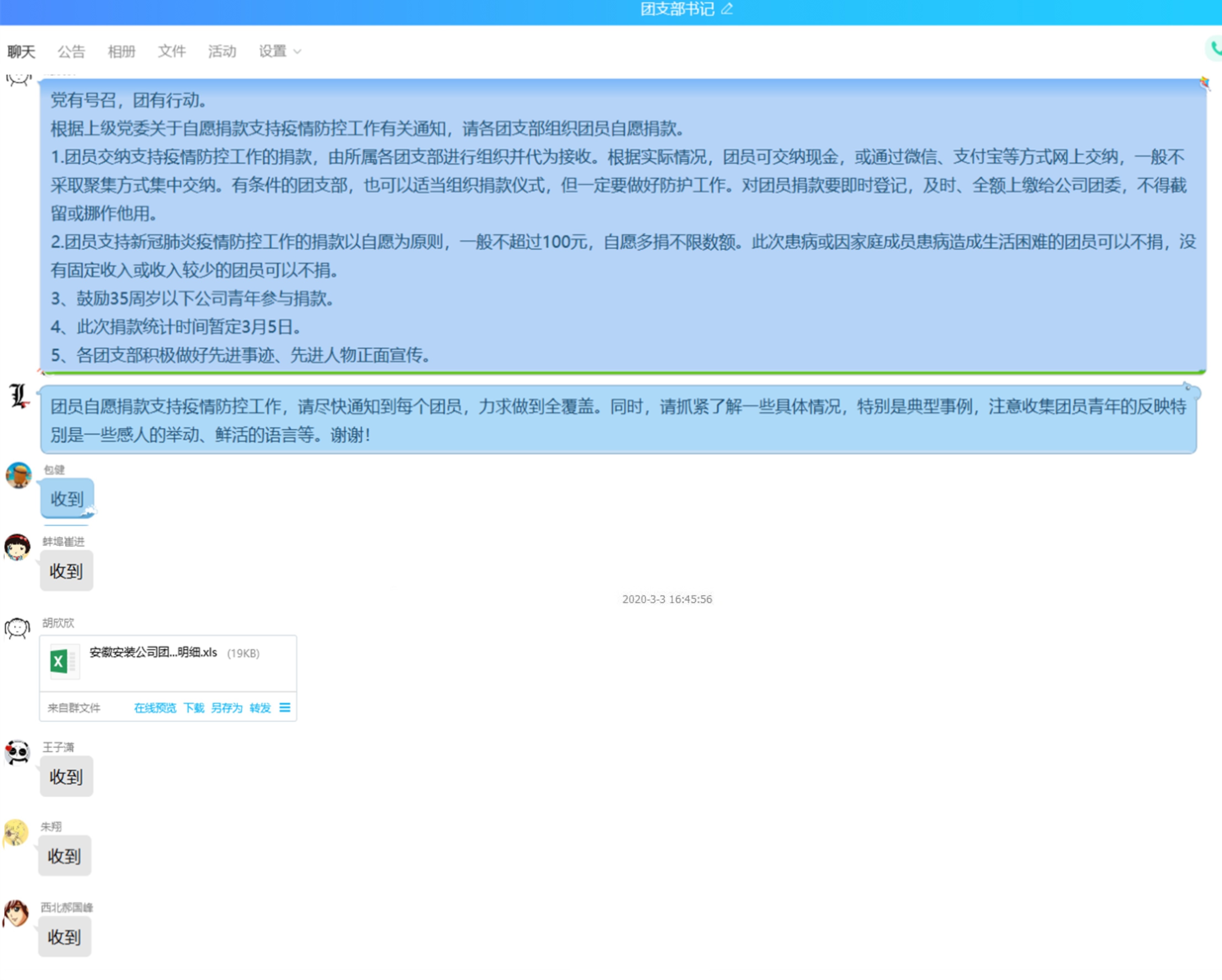 在這次疫情“抗戰”中,安徽安裝公司的團員青年們在各自的崗位堅守陣地,貢獻力量。各團支部書(shū)記帶頭“作戰”,有的積極配合社區進(jìn)行防疫登記,有的堅守崗位做好公司防疫消毒工作,有的在項目一線(xiàn)積極進(jìn)行防疫宣傳。各團員青年充分發(fā)揮生力軍作用,機關(guān)團支部徐君婷給社區捐獻了51個(gè)N95口罩,合肥團支部陳濤濤、馮俊、蚌埠分公司團支部王大旭等為公司想方設法采購防疫物資,西北分公司團支部劉金蓮給當地紅十字會(huì )捐款······他們以實(shí)際行動(dòng)亮身份樹(shù)形象, 當好“戰斗員”,當好“宣傳員”,助力身邊的疫情防控工作,依法科學(xué)有序參與疫情聯(lián)防聯(lián)控。