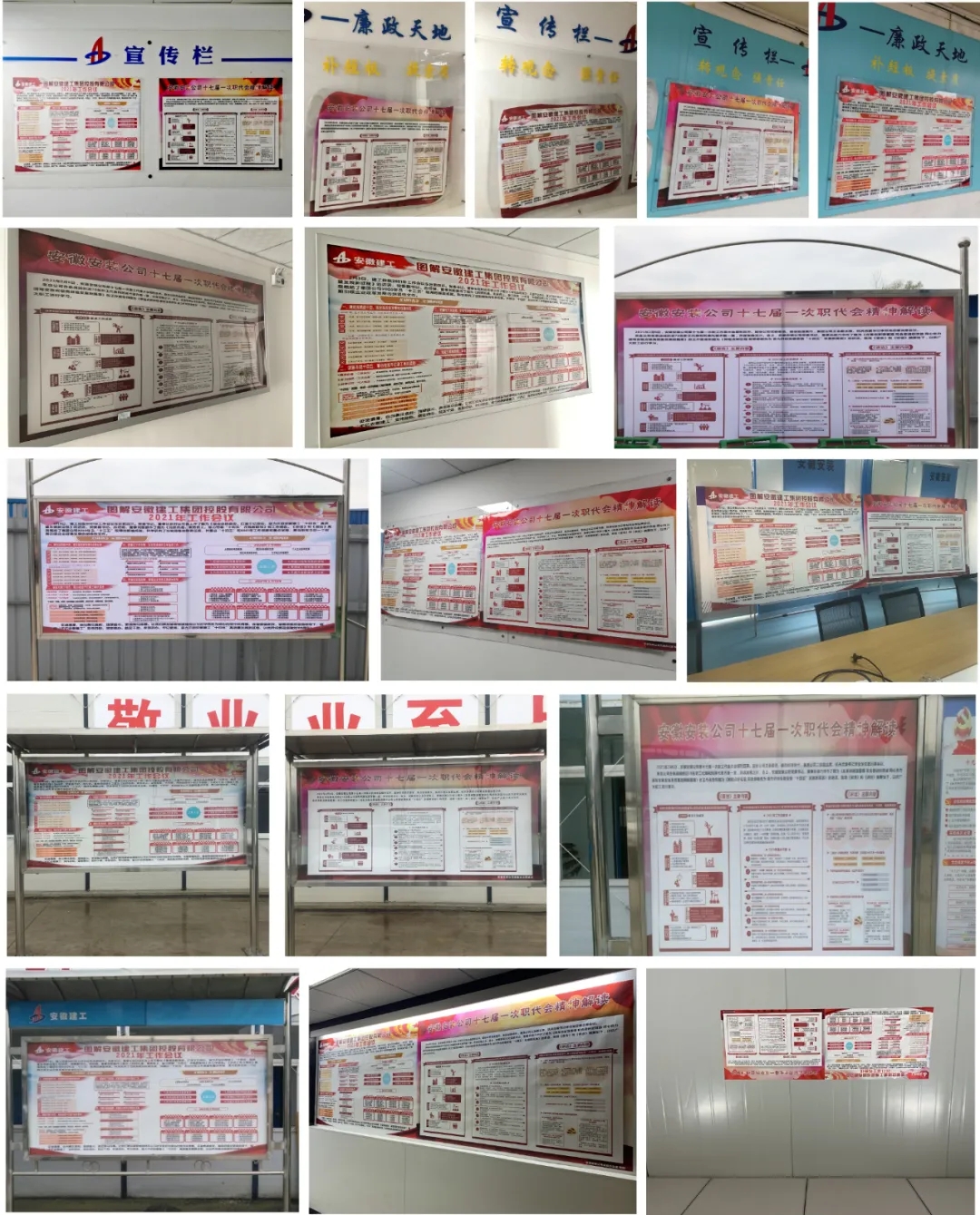 二是順勢推進(jìn)、以點(diǎn)帶面,采取各種方式營(yíng)造濃厚學(xué)習氛圍。在兩級會(huì )議召開(kāi)以后,公司黨委辦公室第一時(shí)間編印宣傳欄及圖解,并及時(shí)發(fā)布在微信公眾號,廣泛宣傳,讓集團工作會(huì )議和公司職代會(huì )精神人人皆知、入腦入心,進(jìn)一步凝聚共識、形成合力,夯實(shí)思想基礎。年后復工,立即組織各黨支部在機關(guān)及項目部懸掛張貼宣傳圖、發(fā)放宣傳手冊,掀起學(xué)習熱潮,營(yíng)造濃厚氛圍,通過(guò)宣傳主陣地形成輿論“正能量”。