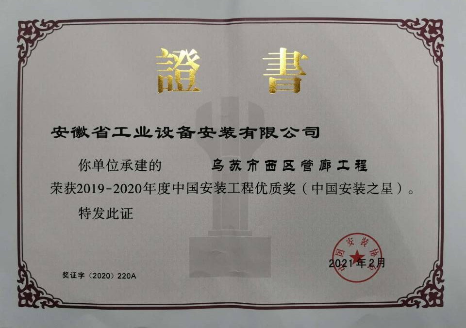 大會(huì )頒發(fā)了2019-2020年度中國安裝工程優(yōu)質(zhì)獎(中國安裝之星)獲獎工程。我公司承建的烏蘇市西區管廊工程榮獲“中國安裝之星”中國安裝工程優(yōu)質(zhì)獎。胡六中董事長(cháng)被授予 “中國安裝工程優(yōu)質(zhì)獎工程企業(yè)領(lǐng)導人”特別榮譽(yù),康永軍經(jīng)理被授予“中國安裝工程優(yōu)質(zhì)獎工程項目經(jīng)理”特別榮譽(yù)。