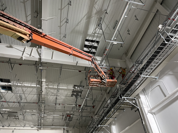 圖為室內電氣班組正在進(jìn)行高天棚燈具安裝,對剩余工程量進(jìn)行最后的沖刺