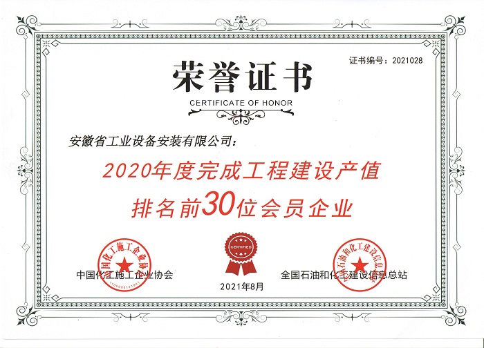 2021年4月,公司迅速行動(dòng)、充分準備,通過(guò)中國化工施工企業(yè)協(xié)會(huì )管理系統上報企業(yè)各類(lèi)資料。近日,經(jīng)過(guò)中國化工施工企業(yè)協(xié)會(huì )與全國石油和化工建設信息總站匯總評比,我公司榮膺中國化工施工企業(yè)協(xié)會(huì )2020年度工程建設產(chǎn)值排名前30位會(huì )員企業(yè)。