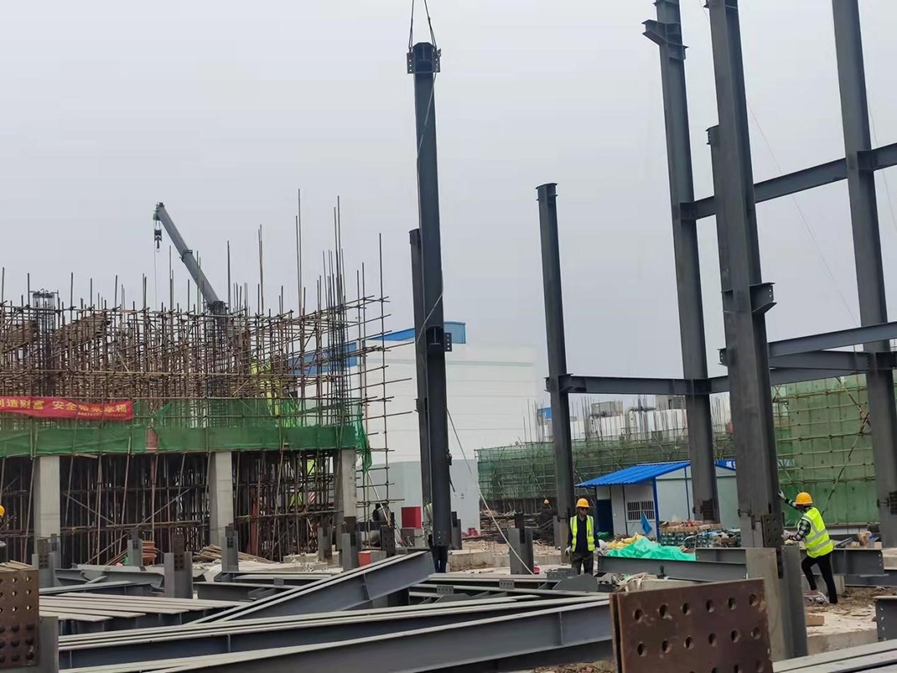 發(fā)酵車(chē)間C區鋼結構區域,吊裝作業(yè)正在如火如荼進(jìn)行;B區滿(mǎn)堂腳手架緊張搭設,鋼筋工頂著(zhù)烈日進(jìn)行鋼筋綁扎,投料車(chē)間兩臺挖機聯(lián)動(dòng),進(jìn)行管廊支架基礎基坑開(kāi)挖,控制車(chē)間正在忙忙碌碌進(jìn)行內墻二次結構砌筑。各個(gè)車(chē)間有條不紊的忙碌著(zhù),整個(gè)項目現場(chǎng)一片火熱,迅速掀起“比、學(xué)、趕、幫、超”施工高潮!