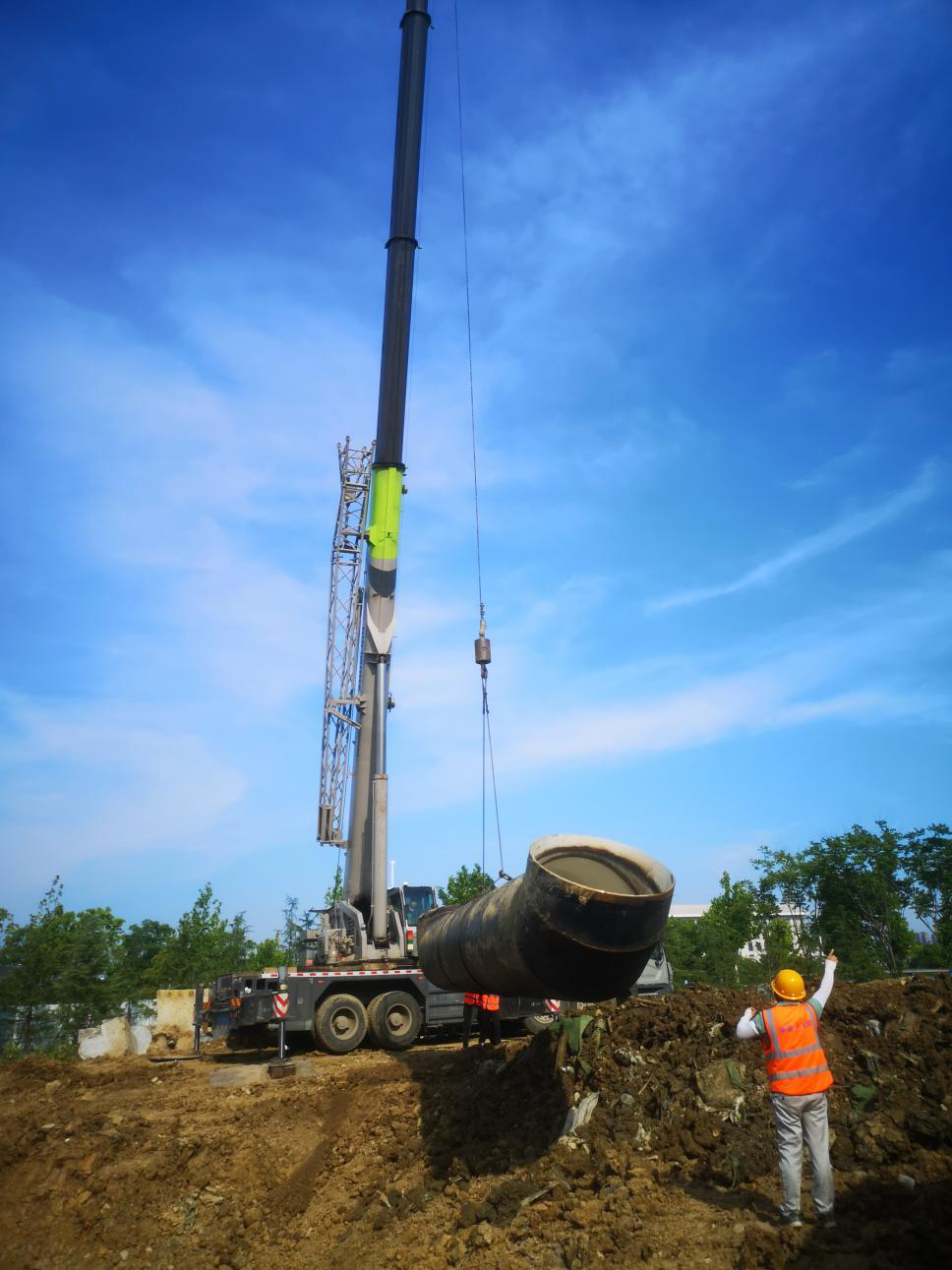 圖為市政分公司四水廠(chǎng)項目80噸吊車(chē)正在對DN1800螺旋鋼管進(jìn)行吊裝