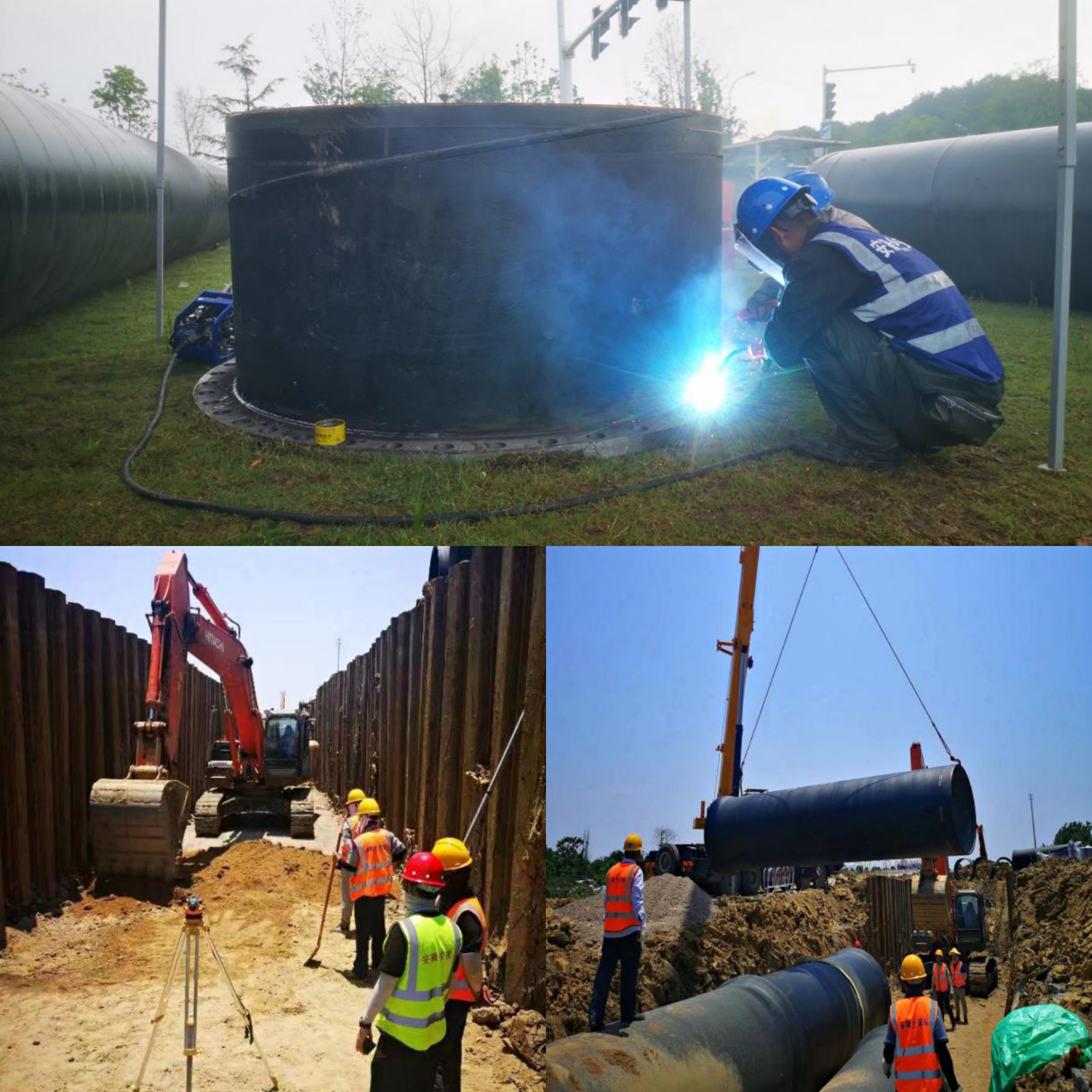 圖為市政分公司四水廠(chǎng)DN1800、DN1400供水管道遷建工程管網(wǎng)項目正在緊張施工。1.焊花綻放、夏季中最美的煙花,2名焊工,正在對DN1800鋼管與法蘭進(jìn)行焊接(上圖)2. 50噸吊車(chē)正在對DN1800球墨鑄鐵管進(jìn)行吊裝(右下圖);3. 槽底換填、鋪砂墊層(左下圖)