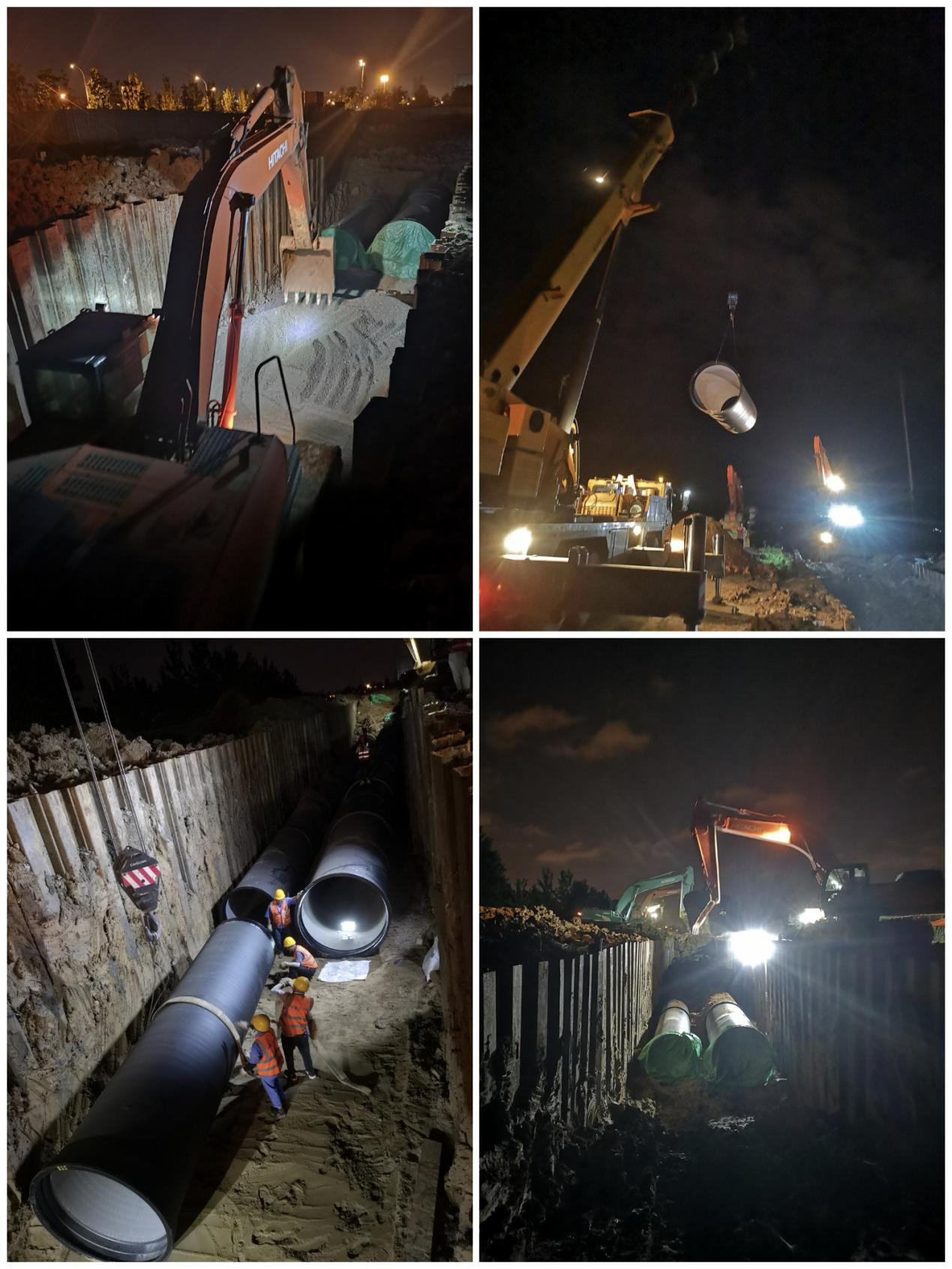 圖為市政分公司市政分公司四水廠(chǎng)DN1800、DN1400供水管道遷建工程管網(wǎng)項目晚間施工。1.鋪設砂墊層。挖掘機對溝槽底部進(jìn)行換填(左上圖);2.起重吊裝。50噸汽車(chē)吊將DN1800球墨鑄鐵管吊放至溝槽內(右上圖);3.球墨鑄鐵管安裝。管工正在校正管道軸線(xiàn),進(jìn)行管道安裝(左下圖);4.溝槽回填。球墨鑄鐵管安裝完成后,挖掘機進(jìn)行管道覆土回填(右下圖