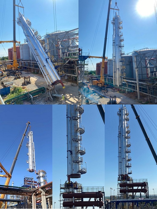 陣陣轟鳴聲中,汽提塔上段在兩臺500噸、160噸吊車(chē)的默契配合下緩緩升高,直至完全吊離鞍座。15時(shí)48分,汽提塔上段豎立,溜索摘除,由主吊車(chē)穩步吊向汽提塔下段上方,對準接口慢慢落下,工人師傅立即上前組對點(diǎn)口,16時(shí)12分點(diǎn)口完成。為爭取寶貴時(shí)間,項目部實(shí)行管理人員輪班制、班組夜間倒班制,通宵焊接作業(yè),于次日中午時(shí)分完成組對焊接。為保證組對質(zhì)量,剛焊接完的汽提塔上段還要被吊車(chē)“提拎著(zhù)”靜置12小時(shí)以上。最終在8月7日7時(shí)48分,隨著(zhù)主吊車(chē)緩緩摘鉤,安慶石化200噸/時(shí)污水汽提裝置項目重要節點(diǎn)——汽提塔上段空中組對完美收官,整個(gè)過(guò)程歷經(jīng)40個(gè)小時(shí)。