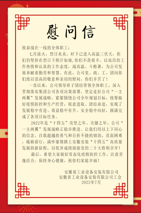 為做好高溫季節勞動(dòng)保護和防暑降溫工作,保障高溫天氣始終堅持在一線(xiàn)崗位員工的身體健康。7月-8月,安徽安裝公司工會(huì )結合職工代表巡察,到分公司在建項目開(kāi)展“送清涼”活動(dòng),親切慰問(wèn)施工一線(xiàn)員工,并為他們送去清涼和關(guān)愛(ài)。