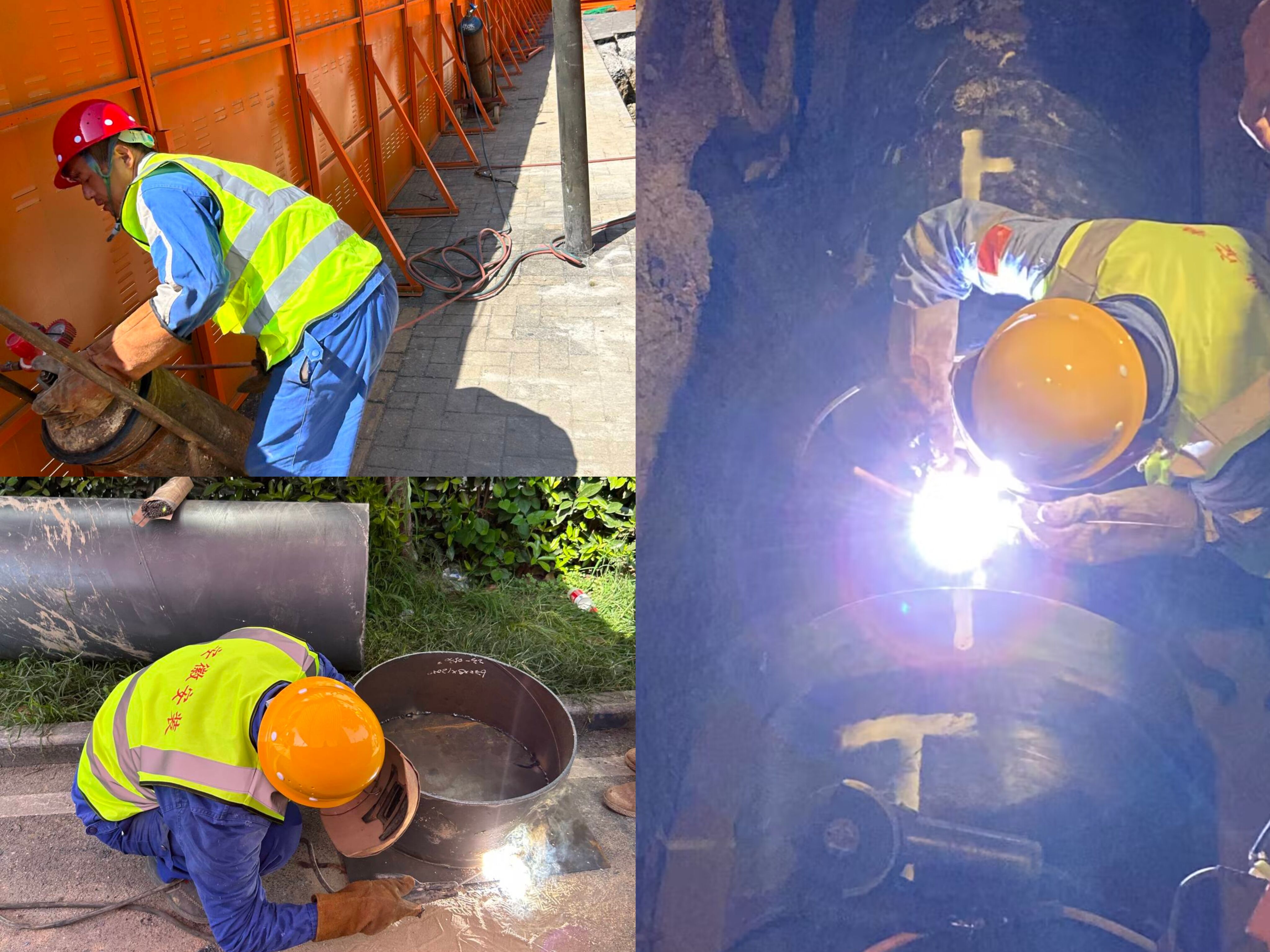 圖為:蕪湖路蒸汽管網(wǎng)改造工程乙炔瓶搬運、套管焊接及直埋蒸汽保溫管道焊接施工