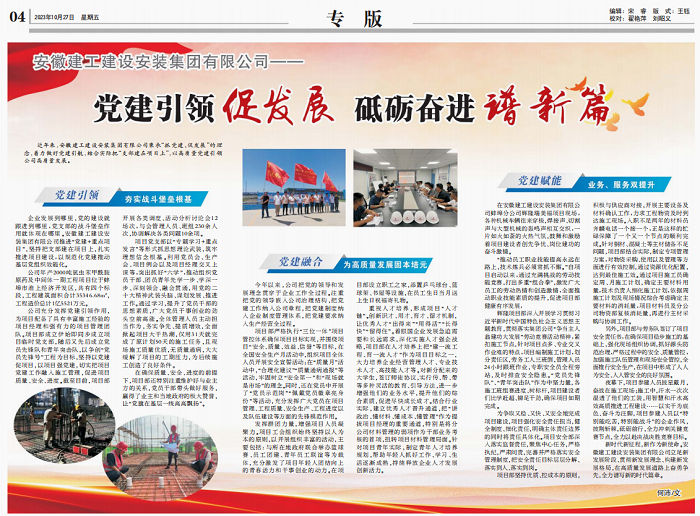 近年來(lái),安徽建工建設安裝集團有限公司秉承抓黨建促發(fā)展的理念,著(zhù)力做好黨建領(lǐng)航,結合實(shí)際把支部建在項目上,以高質(zhì)量黨建引領(lǐng)公司高質(zhì)量發(fā)展。
