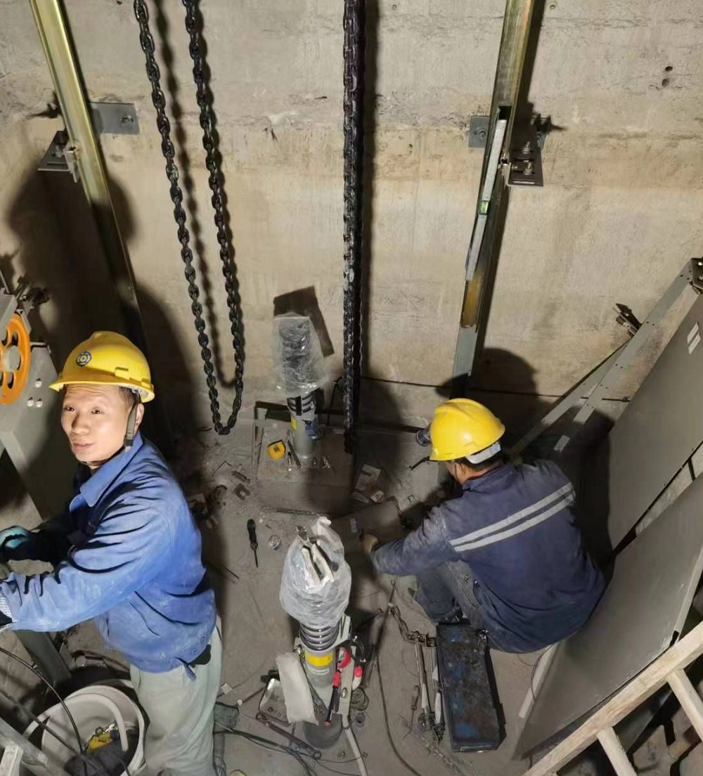 長(cháng)三角一體化中新蘇滁高新區高端智能制造產(chǎn)研基地項目現場(chǎng)安裝人員正在收緊鋼絲繩、調整電梯緩沖距離