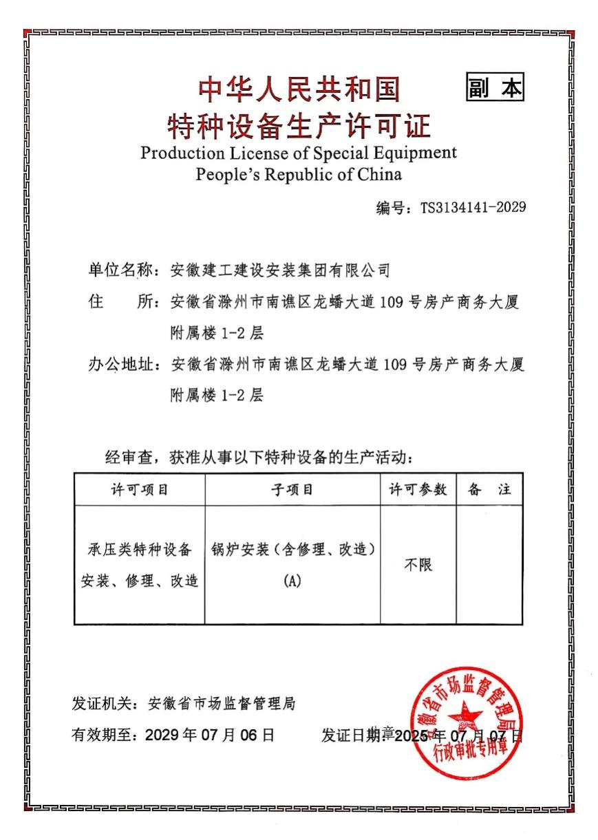 建工安裝順利取得鍋爐特種設備許可A級證書(shū)