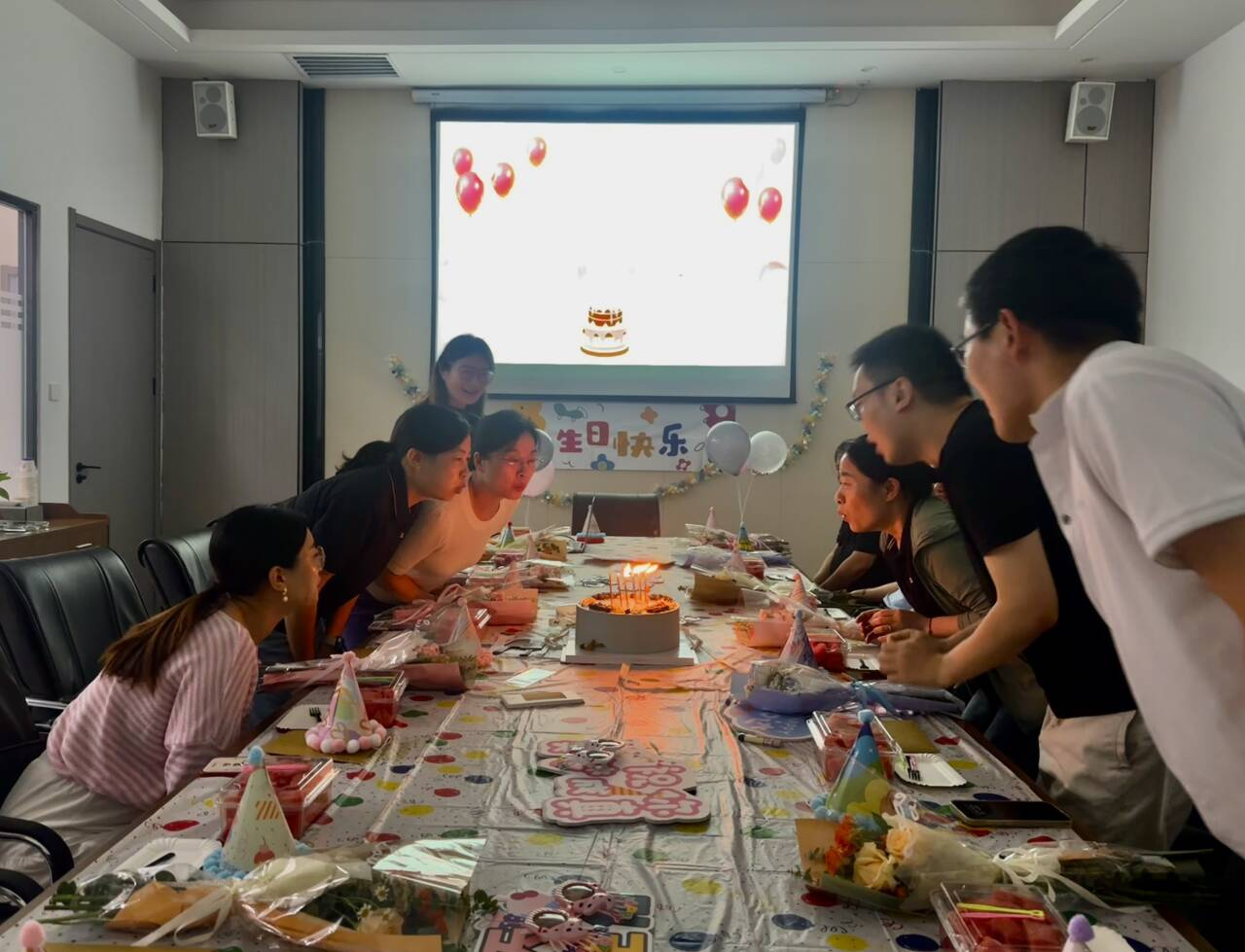 下午5點(diǎn),隨著(zhù)三季度“壽星”們笑容滿(mǎn)面地陸續來(lái)到會(huì )議室,生日會(huì )的溫馨序曲正式奏響——工會(huì )工作人員為每位到場(chǎng)的“壽星”遞上印有手寫(xiě)祝福的生日賀卡,隨著(zhù)“祝你生日快樂(lè )···”音樂(lè )響起,大家圍在一起吹蠟燭、吃蛋糕、送生日祝福,現場(chǎng)氣氛熱烈,充滿(mǎn)了歡聲笑語(yǔ)。